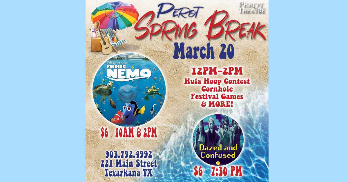 Perot Theatre Management Company is proud to announce Perot Spring Break movies and activities on March 20, 2021. Finding Nemo will play on the largest indoor movie screen in town at 10:00 am and 2:00 pm. Movie tickets are $6.00 per person for either showing. From 12:00 pm to 2:00 pm, activities bring Spring Break to Main Street with hula hoop contests, cornhole, hop scotch, and more.