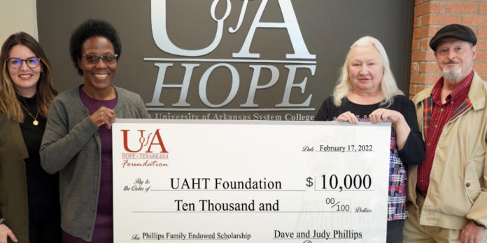 The Phillips Family Endowed Scholarship was established at the University of Arkansas Hope-Texarkana today by Dave and Judy Phillips of Emmet, Arkansas. Preference for the scholarship is given to a student pursuing a degree in Industrial Maintenance or Heating, Ventilation, and Air Conditioning.