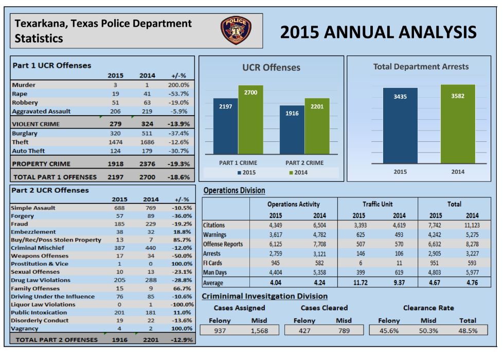 According to a 2015 Annual Analysis Report and Chief Shiner crime rates in Texarkana have decreased.
