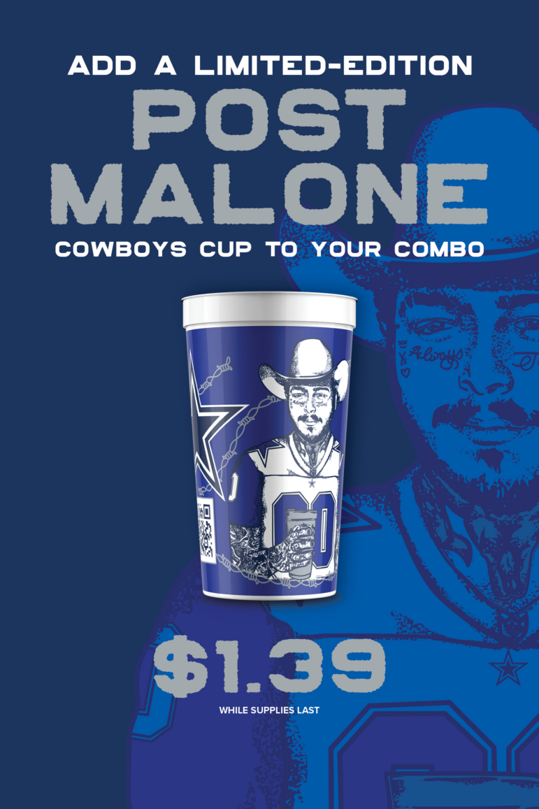 Like the previous collector’s cups, these cups were designed by Post and inspired by his iconic style and love for the Cowboys. Post worked closely on this project, even bringing on DFW-based artist Matt Cliff to work on the collector’s cup, which features Post in a Cowboys jersey and cowboy hat, the Cowboys logo, and a QR code that can be scanned for a chance to win tickets to a Dallas Cowboys home game. Fans can get their hands on a Cowboys collector’s cup by “Posting Up” their combo for $1.39.
