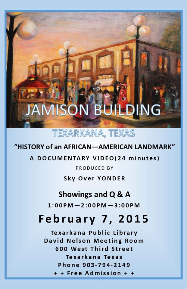 JAMISON BUILDING: History of an African-American Landmark is a documentary (run time 24 min) produced by Sky Over Yonder. Join us at Texarkana Public Library for three free showings at 1:00pm; 2:00pm; and 3:00pm on Saturday February 7th.