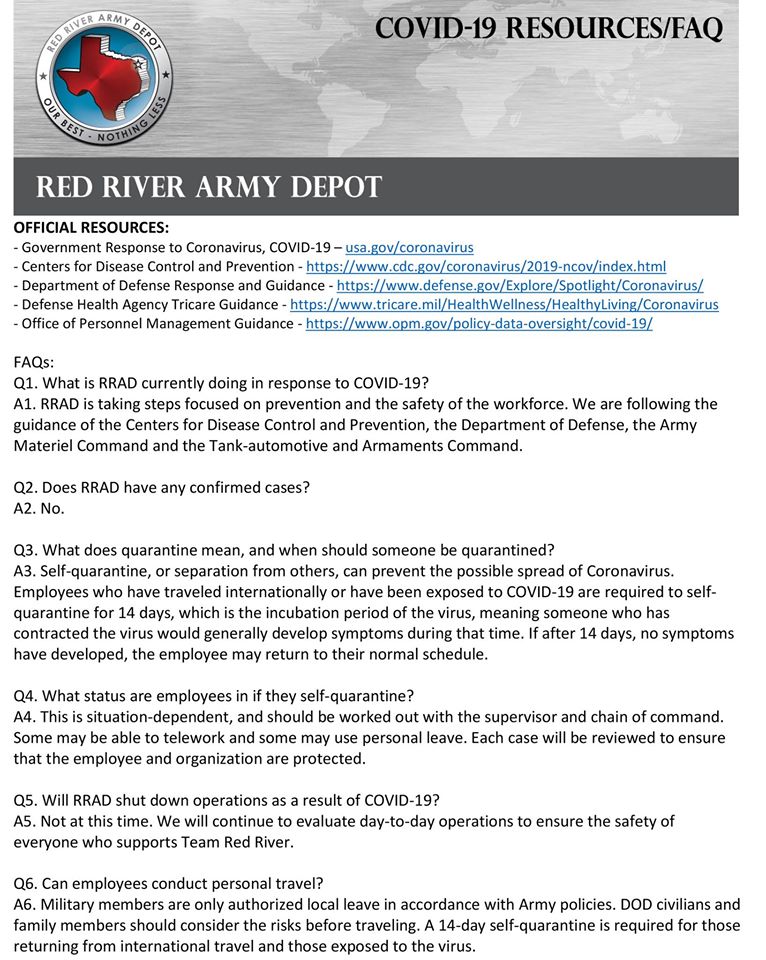 According to a post on the Red River Army Depot Facebook page, there are no confirmed cases of COVID-19 at the Depot.