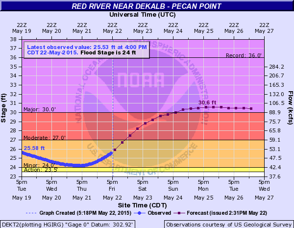 THE FLOOD WARNING CONTINUES FOR THE RED RIVER NEAR DEKALB, TEXAS. * UNTIL FURTHER NOTICE… OR UNTIL THE WARNING IS CANCELLED. * AT 8:00 AM FRIDAY THE STAGE WAS 24.9 FEET. * MINOR FLOODING IS OCCURRING AND MAJOR FLOODING IS FORECAST. * FLOOD STAGE IS 24 FEET. * FORECAST… THE RIVER WILL CONTINUE RISING TO NEAR 30.3 FEET BY EARLY MONDAY MORNING THEN BEGIN FALLING. * IMPACT… AT 30.0 FEET… SOME THREE THOUSAND ACRES OF FARM LAND AND PASTURE FLOOD. LIVESTOCK MUST BE EVACUATED TO HIGHER GROUND. MUCH OF THE FLOOD PLAIN IS INUNDATED, AND PREPARATIONS FOR A MAJOR FLOOD SHOULD BE MADE. * ADDITIONAL VERY HEAVY RAINFALL REMAINS QUITE POSSIBLE OVER THE ENTIRE UPPER RED RIVER BASIN DURING THE NEXT SEVEN DAYS. UPWARDS OF SIX INCHES OF RAIN REMAIN POSSIBLE THROUGH MUCH OF NEXT WEEK ACROSS THE RED RIVER AND ITS TRIBUTARIES IN SOUTHERN OKLAHOMA AND NORTH TEXAS. AREA RESERVOIRS INCLUDING LAKE TEXOMA CONTINUE TO FILL AS THIS VERY WET SPRING OF 2015 CONTINUES. SOILS REMAIN SATURATED ACROSS NORTH TEXAS AND SOUTHERN OKLAHOMA AND NEARLY ALL OF THE RED RIVER’S TRIBUTARIES REMAIN ABOVE FLOOD STAGE. * AREA FARMERS… RANCHERS… AND RESIDENTS ON THE RED RIVER NEED TO CLOSELY MONITOR THE WEATHER AND RED RIVER STAGES THROUGH THE FIRST WEEK OF JUNE. A MAJOR FLOOD EVENT COULD DEVELOP DURING THIS MEMORIAL DAY WEEKEND AND INTO THE FINAL WEEK OF MAY. TAKE ACTION NOW TO PROTECT LIVES, PROPERTY, AND LIVESTOCK AS MAJOR FLOODING IS FORECAST IN THE AREA!