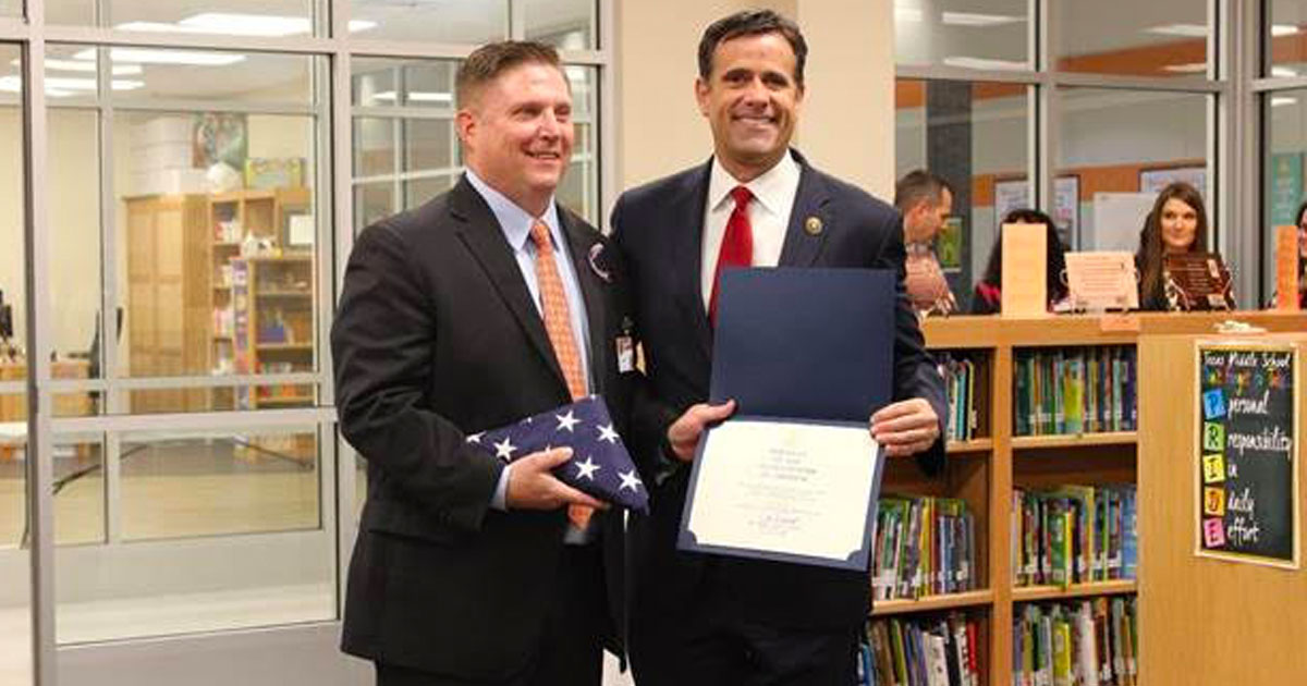 Ratcliffe presented Lambert with a flag over the U.S. Capitol to commend him for achieving statewide recognition for his success as Texas Middle School’s Principal.