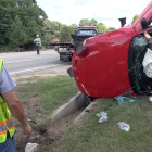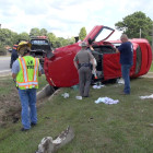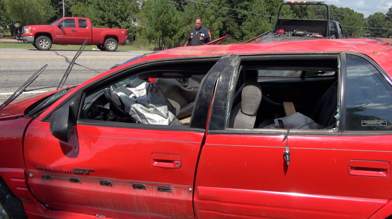 Tire marks could be seen where the vehicle left the roadway around 60 yards before rolling over and coming to rest on its side. Chad Pounds was traveling behind the car when the accident happened, and stopped and rendered aid until paramedics arrived. According to an on scene witness the driver appeared to have serious injuries, the younger boy passenger didn’t appear to have major injuries.