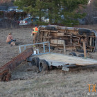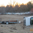 The Ford Explorer was pulling a trailer with a large beam on it when it lost control and rolled disconnecting from the trailer.