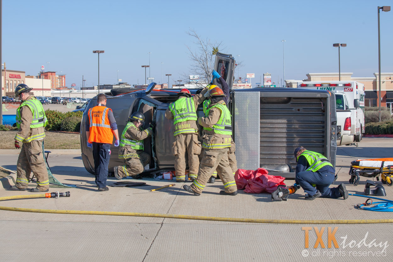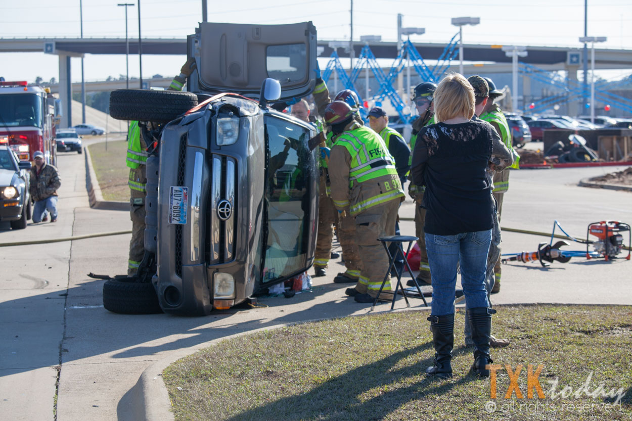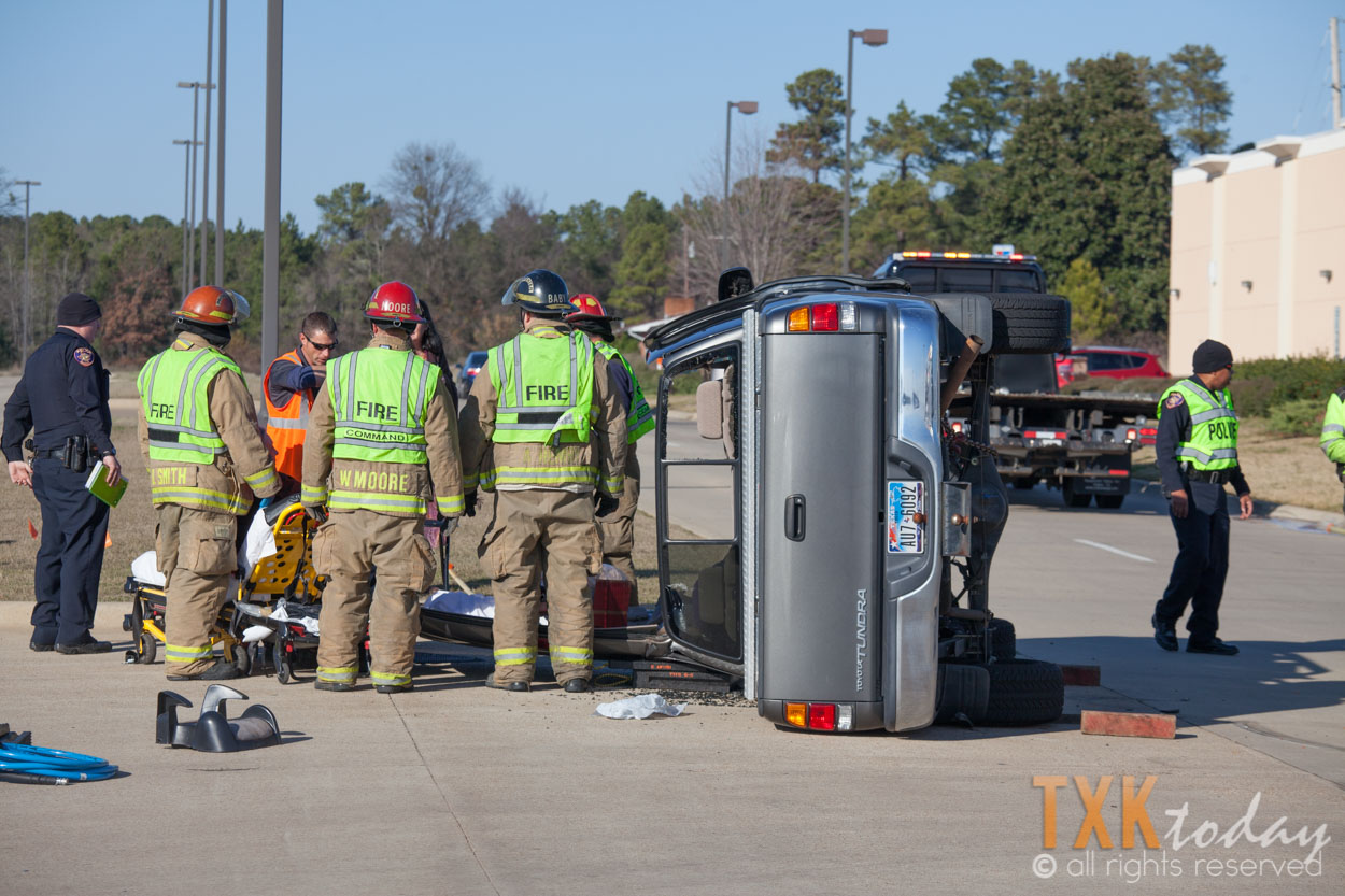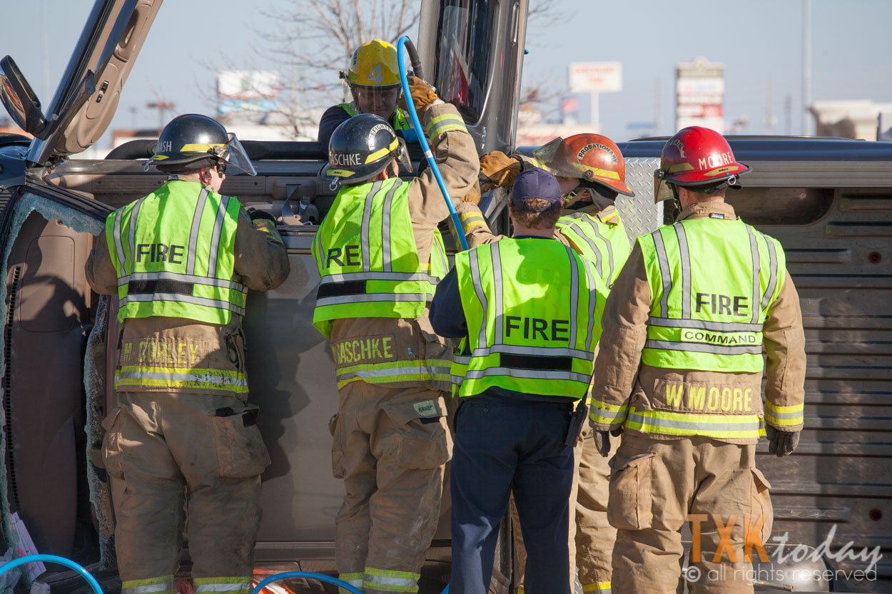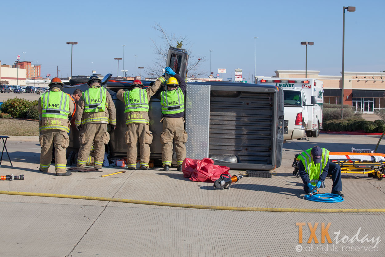 Texarkana, Texas Firefighters were quickly on scene and stabilized the vehicle. Firemen used hydraulic rescue tools to remove the roof of the truck to gain access to the driver.