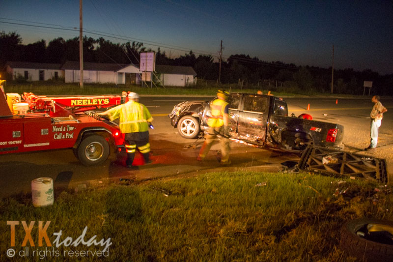 According to on scene witnesses the truck had pulled into the parking lot of the bar to turn around and pulled in front of a car traveling north on 71. The driver of the truck was checked out by LifeNet on scene but was not transported by ambulance. There were no injuries.