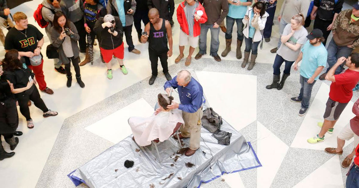 The more money the campus and community put towards the fundraiser, the more members of Sigma Pi who gave up their hair. In the end, at least 14 of the “Sig Pi’s” had their heads shaved down to the scalp in the SAU Reynolds Center Wednesday, March 9.
