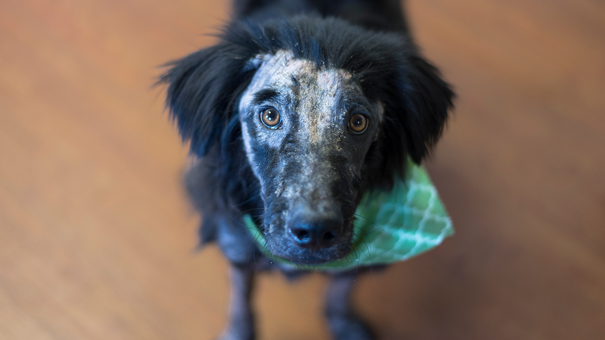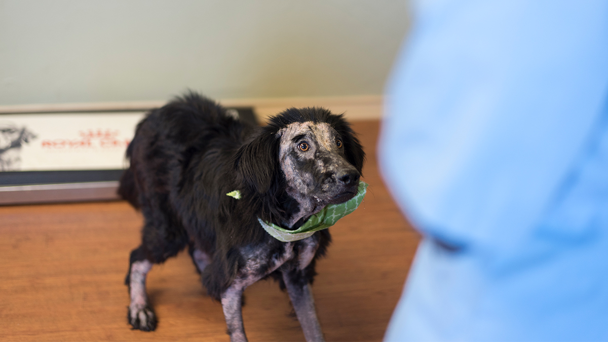 Leo should weigh 85 lbs at his age of 1 year but is currently 25 lbs underweight. The type of mange that Leo has presents itself in an abnormal pattern where the hair falls out and skin breaks out on his face, legs, and torso. The genetic disease presents itself when the animal is under high stress. Having been left outside freezing, starved, and neglected, Dixon undoubtedly saved Leo’s life.