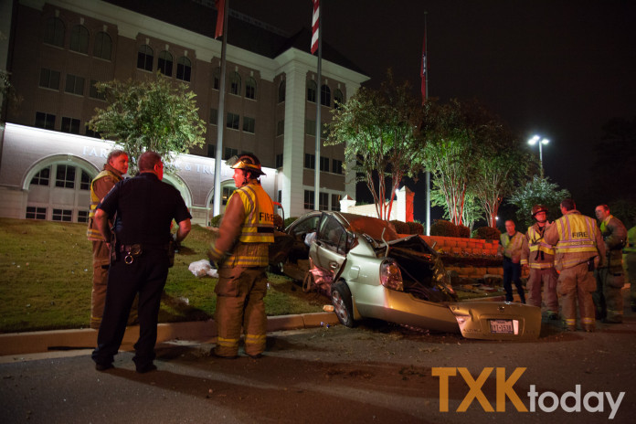 1:45 a.m. Sunday | Texarkana, Texas Police and Fire responded to a major single vehicle accident on St. Michael Dr. in front of Farmers Bank early Sunday morning.