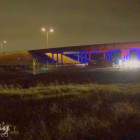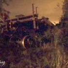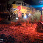 The vehicle crossing the railroad tracks caused damage to the tracks which caused a train that soon passed the spot to derail at least 13 empty flatbed rail cars. The locomotives were still upright and appeared to be still on the track. A small brush fire between the locomotives started but burned itself out shortly.