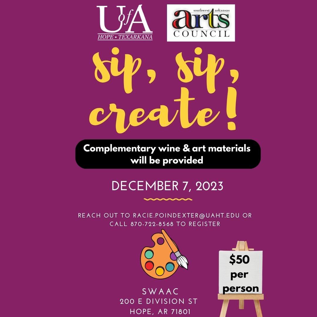 The University of Arkansas Hope-Texarkana, in partnership with the Southwest Arkansas Arts Council, will host a unique community education course entitled “Sip, Sip, Create” on December 7 at 5:00 p.m. Join us for a night of creative expression, laughter, and relaxation as you explore your artistic side while indulging in complimentary wine.