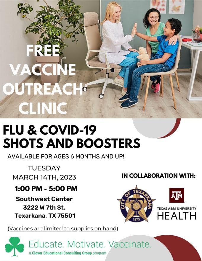 On Tuesday, March 14th, from 1:00 p.m. to 5:00 p.m. the City of Texarkana, Texas Health Department, TAMU Health, and Clover Educational Consulting Group will once again host a free flu and COVID-19 vaccine clinic at the Southwest Center, offering the community a second chance to get vaccinated.