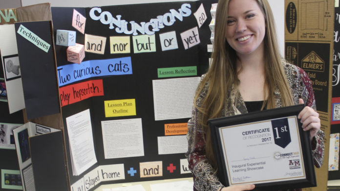 Sydney Steed of Texarkana, Texas, received first place for her first-grade student teaching display on conjunctions for her Classroom and Behavior Management course. Leira Moore of Redwater, Texas, won second place for her ALT Magazine Graphic Design display for her Mass Communication Independent Study. Esther Pippins of Texarkana, Texas, received third place for her Adult Education display for her Graduate Capstone Teacher/Training Symposium.
