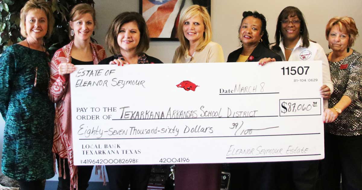 TEXARKANA, AR (March 7, 2017) –– The Texarkana Arkansas School District has received an $87,060.39 estate gift from Eleanor Seymour. Ms. Seymour is a former Arkansas High School history teacher who made an incredible impact in the lives of the students she taught and the staff she worked with.