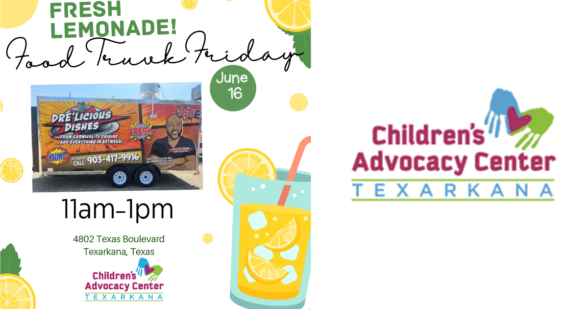 The Texarkana Children’s Advocacy Center will be hosting their first Food Truck Friday event this Friday, June 16th, from 11 a.m.- 1 p.m. at 4802 Texas Boulevard Texarkana, Texas.