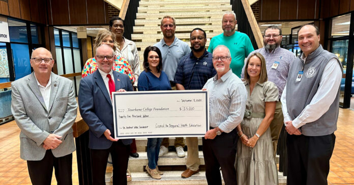 The Council for Regional Health Education presented a $25,000 check to the Texarkana College Foundation today at the Texarkana College Nelson Administration Building. Mayor Bob Bruggeman, board member of the Council for Regional Health Education, said the gift will be used for student nursing scholarships at Texarkana College. The contribution is made in memory of Dr. Herbert Wren and his wife, Jean. Dr. Wren practiced general and thoracic surgery at Collom and Carney from 1962-1994 and was director of the Area Health Education Center (AHEC) from 1987-1995.