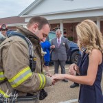 As we were out front taking a group photo multiple fire trucks from Wake Village and Nash came screaming up King Highway Towards Chapelwood Funeral Home. Fire fighters swarmed the crowd and Brad came up face completely covered by a breathing mask. He knelt down on one knee in front of Savannah pulled of his face mask and presented a ring asking if she would marry him.