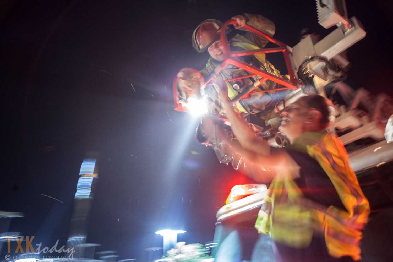 TTPD then requested assistance from the Texarkana Texas Fire Department and Ladder 743 was dispatched to the scene. The ladder had no problem reaching the height but the kitten kept moving away from the edge causing the truck to have to reposition twice.