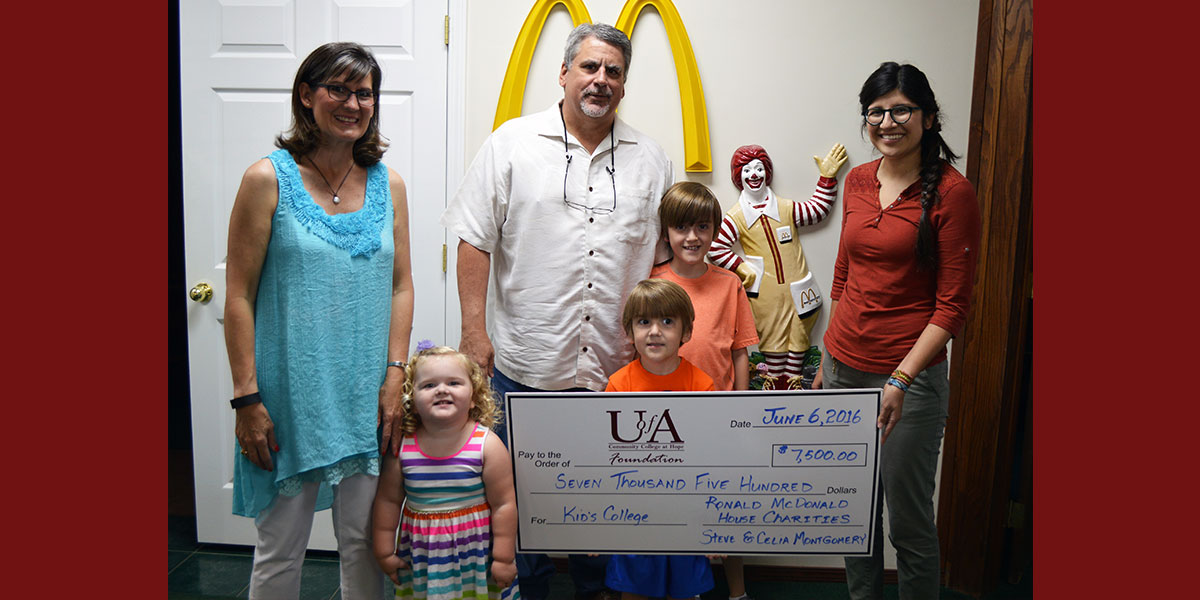 Ronald McDonald House Charities of Texarkana recently donated $7,500 to the 2016 Kids’ College Program at the University of Arkansas at Hope-Texarkana. The grant is to be used for student scholarships and supplies for teachers. A check was presented by Celia and Steve Montgomery, owners of several McDonald’s restaurants including locations in Hope and Nashville, AR. These local restaurants help fund the RMHC donations by participating in the Donation Box Fundraiser Program. The Montgomery’s and RMHC have provided this grant to Kids’ College since its inception in 2006.