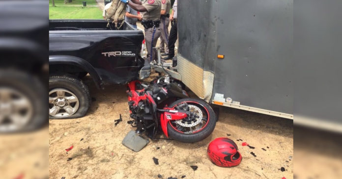 According to Jennings, the preliminary crash investigation indicates that a Toyota Tundra pulling a trailer, was traveling west making a left turn onto a private drive. “A Honda motorcycle, operated by Kodi Kolieo Scott, 23, of Hooks, Texas, was also traveling west on FM-2148 approaching the Toyota pickup and trailer,” said Jennings. “The motorcycle went into side skid before colliding with both the pickup and trailer.”