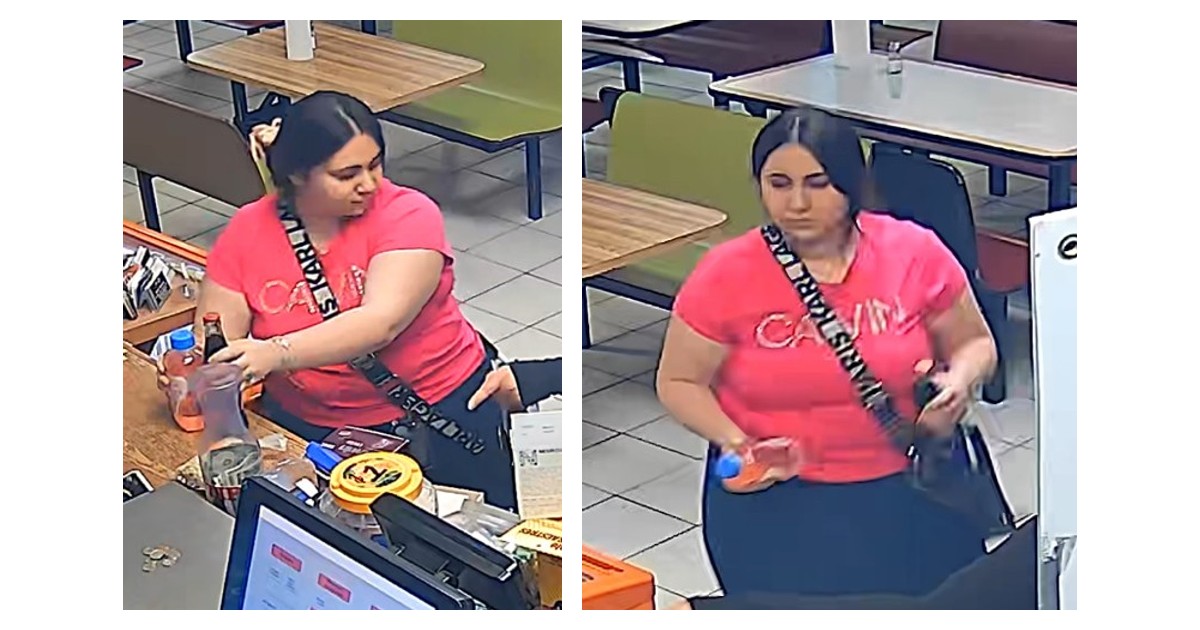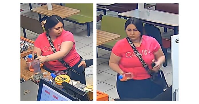 The incident occurred around 8:00 p.m. Friday evening when the woman entered the business with two accomplices — a man and another woman. While the other two kept an employee distracted, the suspect slipped into the office and took a bank bag containing the daily deposit from under the counter.