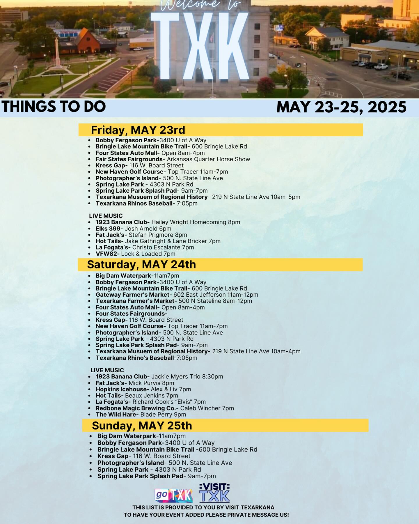 TEXARKANA, USA – Residents and visitors alike can expect a packed slate of activities and entertainment this Memorial Day weekend, May 23–25, 2025, as Texarkana rolls out a full lineup of local events, live music, and family fun across both sides of the city.