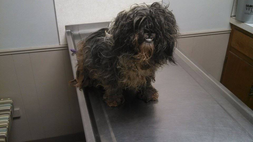 This is the story of events that came together to make something really wonderful happen. This morning I was called by a co-workers dad letting me know he had a small dog, possibly a Shih-Tzu in his trap he had set to catch a nuisance opossum. This dog had been running around the area for almost a year and a half and was living in the woods behind their house, coming out to forage for dog or cat food people had out for their pets, or to eat the food scraps that they threw out there whenever they had any. Before being trapped, the dog would not come to anyone and would run into the woods if anyone approached it. When I arrived, I saw what was the worst matted up dog I had ever laid eyes on…and it had growled at the homeowner when he had approached his trap, so we did not know if it was mean or scared, so I carefully got it from the trap to the cage in the back of my truck….and I have to say, the smell coming from this sweet little dog was almost enough to make me want to throw up.