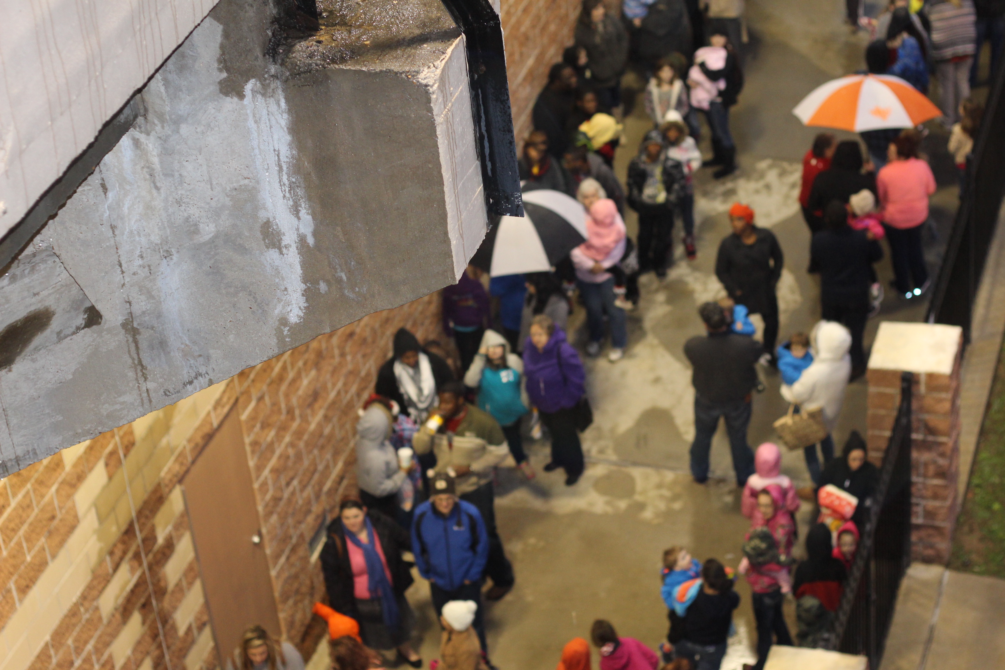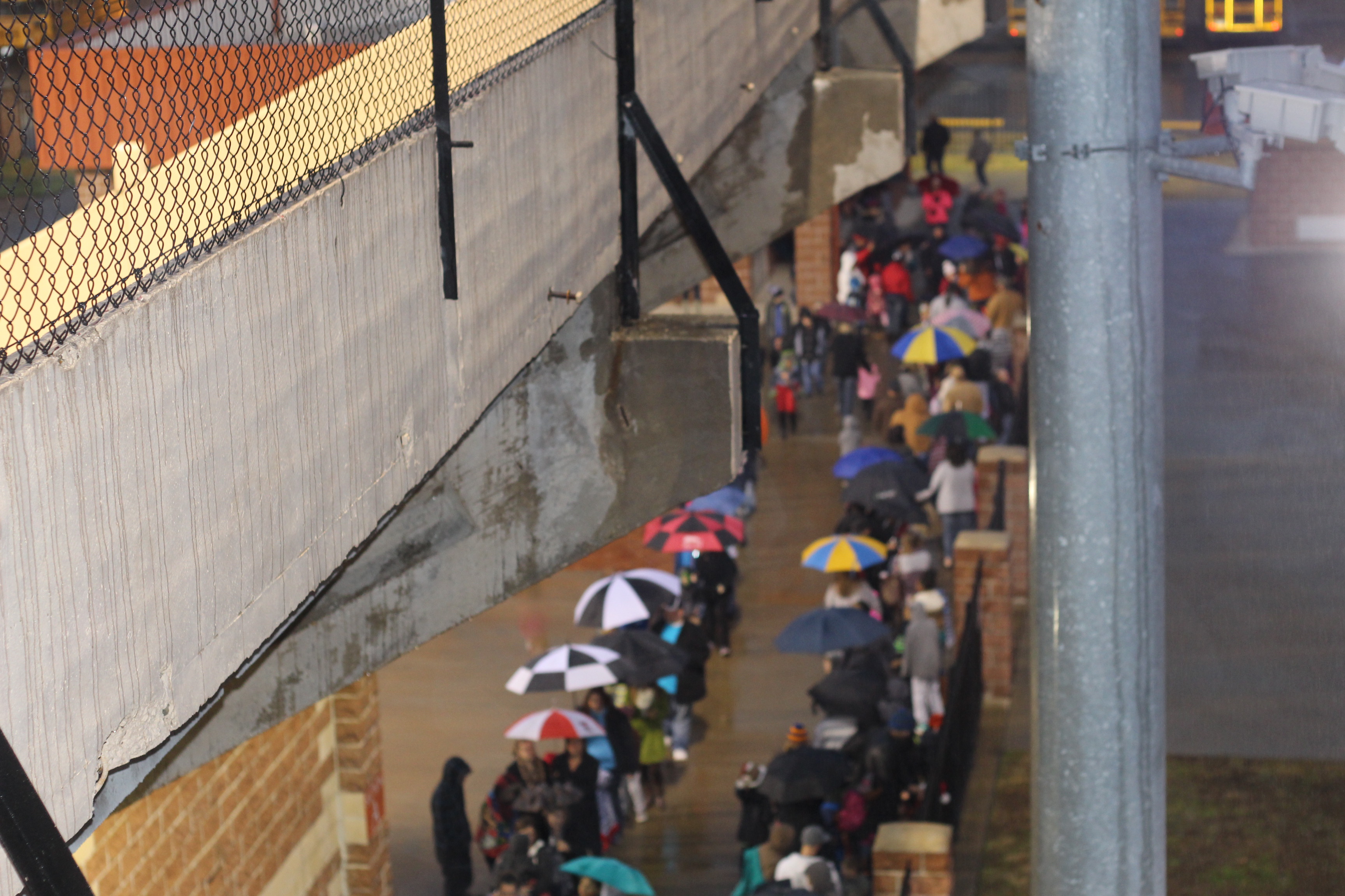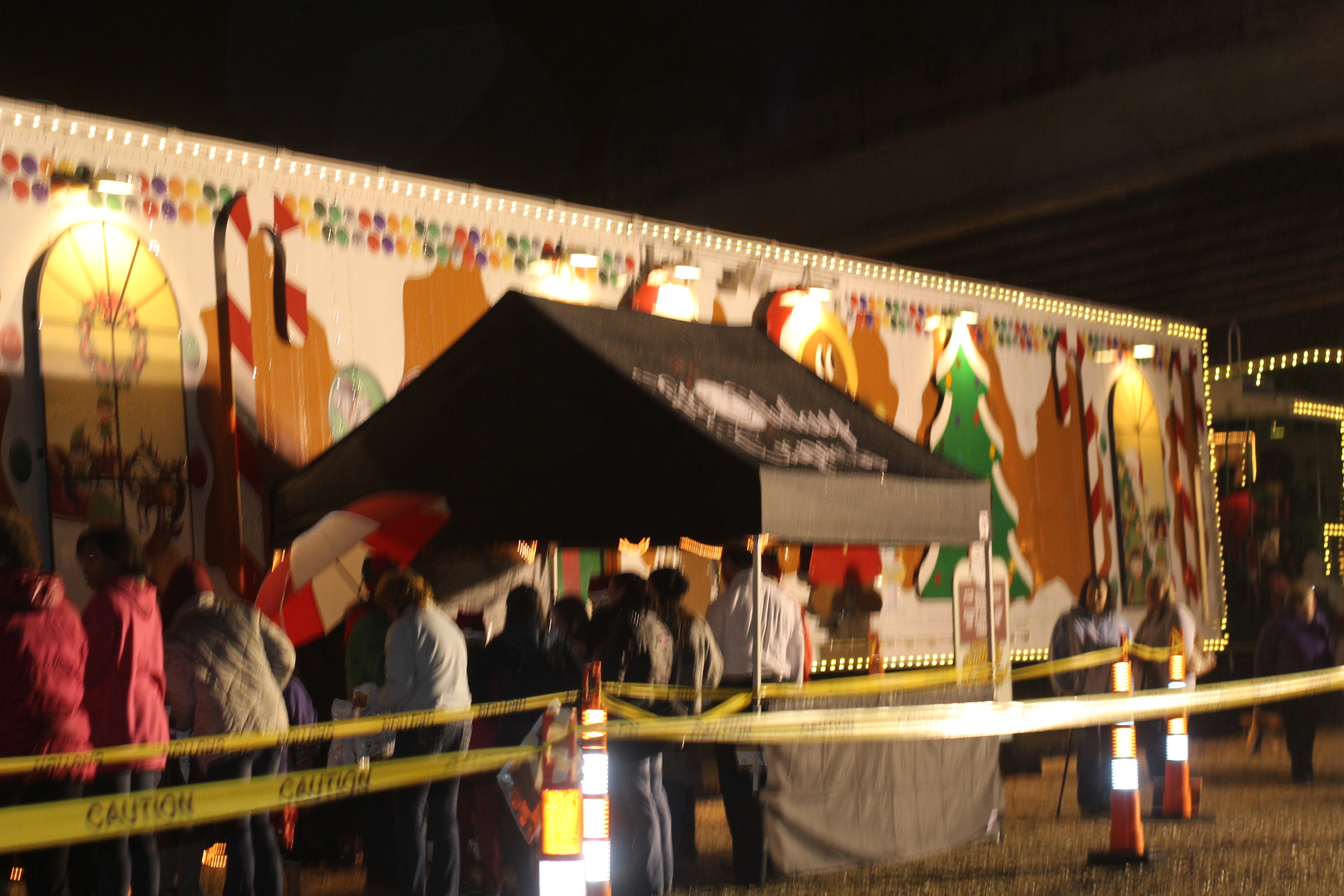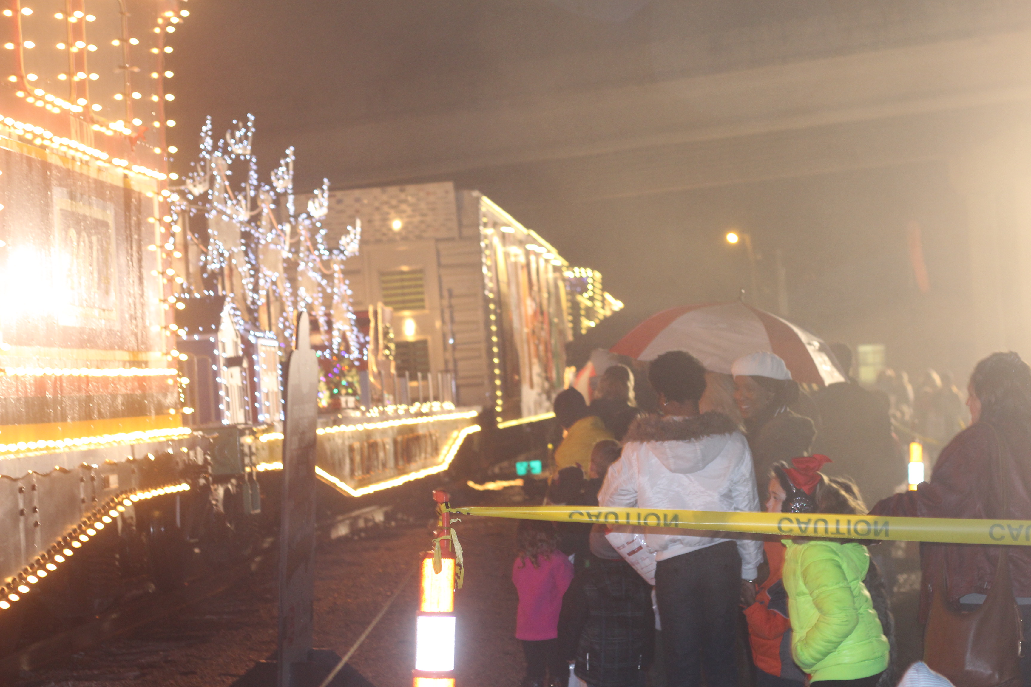 December 12, 2014 | This region must really loves trains and lights and Christmas decorations and elves – well, I guess anything Christmas-y. Thousands of people braved the cold and weather to come out last night (December 11, 2014) to visit the KCS Train. The parking lot at Tiger Stadium was packed and the line for the buses went all the up and back down the sidewalk at least twice – if not three times. It was sprinkling, but most citizens came prepared with warm clothing and umbrellas. The concession stand at Tiger Stadium was open, and probably sold a bunch of hot chocolate.