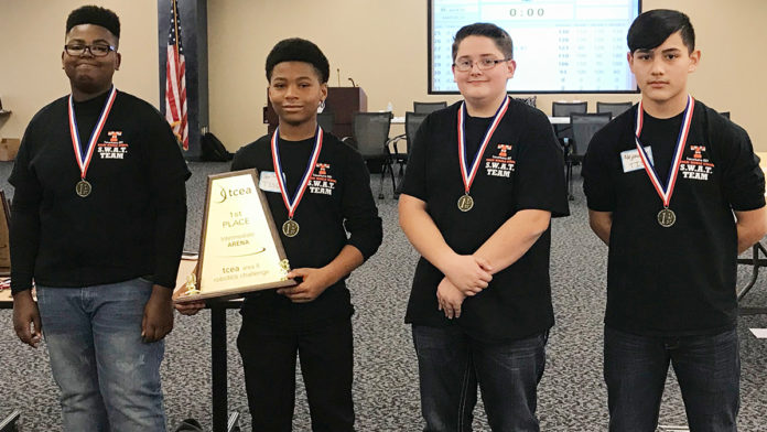Three Texas Middle School SWAT (Students with Amazing Talents) Robotics Teams took top ten placements in the Texas Computer Education Association (TCEA) Area 8 Intermediate Robotics Challenge on January 19 in Mt. Pleasant, TX. A total of 31 teams from the area participated.