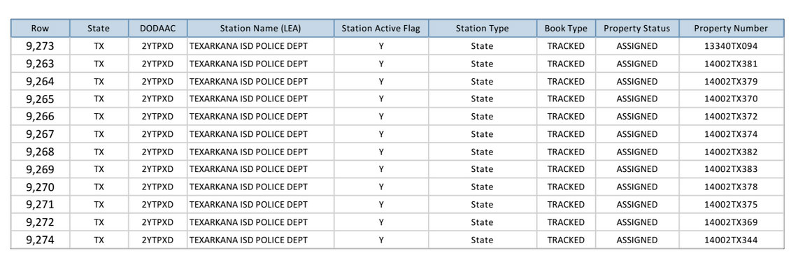 According to KHOU news 10 school districts throughout Texas received military surplus equipment, including trucks, guns, and armor, through a Department of Defense program. Texarkana ISD Police Department being one of the 10 districts that received guns through the Texas 1033 Military Surplus Property Program.