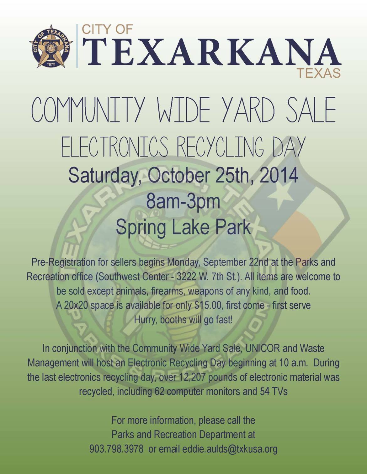 The City of Texarkana, Texas’ Parks and Recreation Department will host the semi-annual community-wide yard sale from 8:00 a.m. – 3:00 p.m. on Saturday, October 25, 2014 at Spring Lake Park. All items are welcome to be sold except animals, firearms, weapons of any kind, and food. A 20×20 space is available for only $15.00, first come – first serve basis.