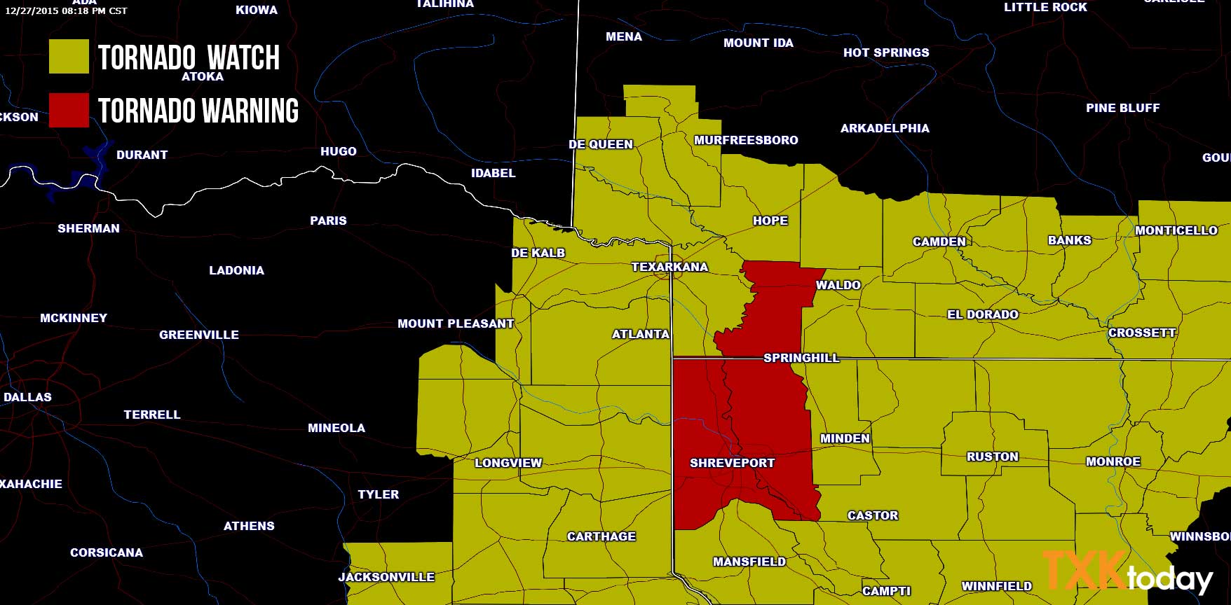 SIRENS ARE SOUNDING IN TEXARKANA, TEXAS. Tornado Warning extended until 6:15 P.M. Take cover now! Move to a basement or an interior room on the lowest floor of a sturdy building. Avoid windows. If you are outdoors… in a Mobile home… or in a vehicle… move to the closest substantial shelter and protect yourself from flying debris.