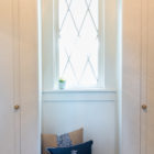 The dining room chandelier is unique because it has hung on both sides of Oak Hill street, moving to 9 Oak Hill house when the previous owners swapped it with the chandelier at 6 Oak Hill Place. The chandelier and diamond windows warm the cool, deep blue wallpaper, leaving a vibrant tone to the elements. The house originally only had wallpaper in the bedrooms, breakfast room, halls, closets on the walls and ceilings, with wall paper costing $0.35 per double roll.