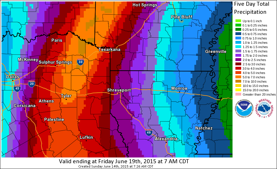The following graphic created by the NWS out of Shreveport represents POTENTIAL rainfall totals through early Friday morning.