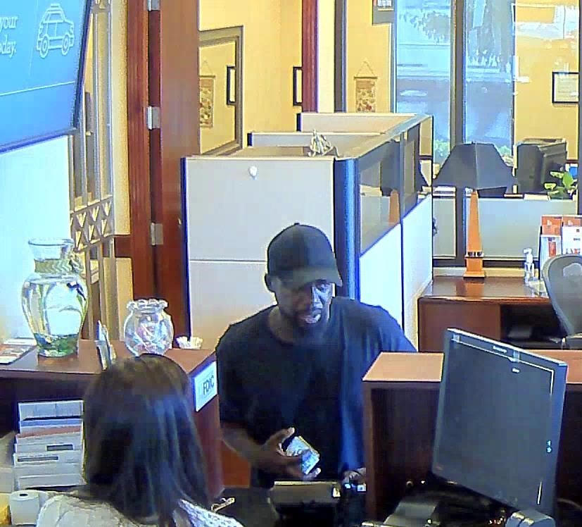 At approximately 2:55 p.m. on August 3, Texarkana, Texas Police responded to a bank robbery call at the Wells Fargo bank in the 1700 block of New Boston Road. The bank teller told officers that a black male, wearing a black t-shirt and a black hat, passed her a note demanding money. The teller complied with the demand and the man left the bank with an undisclosed amount of cash. No weapon was displayed during the robbery.