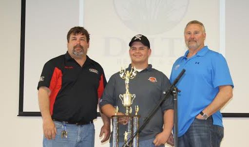 U of A Hope-Texarkana Shooting Sports Team Member Taylor Teague was named the high point shooter of the 2015 Arkansas Collegiate State Clays Championship that was recently held in Tillar, Arkansas at the Delta Resort and Spa. Picture with Teague and his trophy are event organizers Barry Kelly and Chuck Woodson.