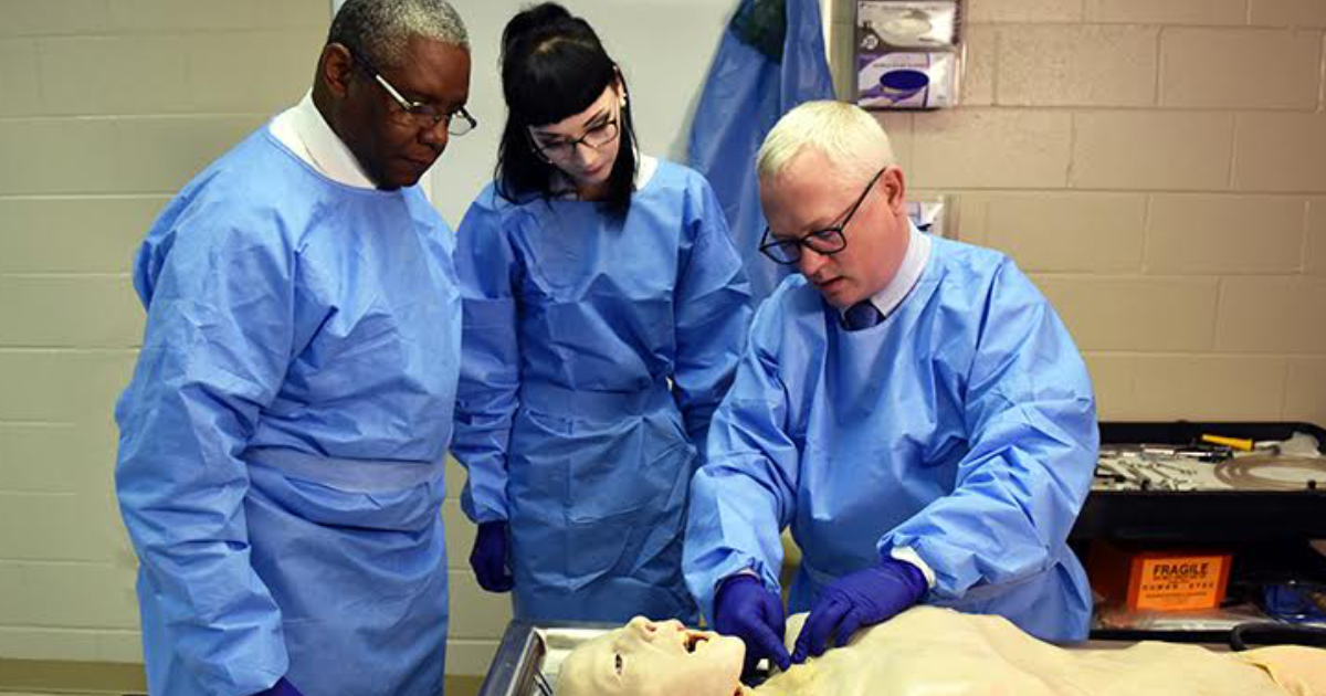 Brad Sheppard, UAHT Funeral Services Instructor, teaches students in the SynDaver lab on the U of A Hope campus.