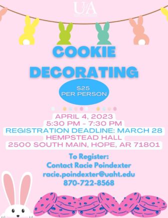 The University of Arkansas Hope-Texarkana will hold a cookie decorating class on Tuesday, April 4, from 5:30 to 7:30 p.m. at Hempstead Hall. This one-day course, taught by Ne’Shay Brown, is hands-on and will instruct students on an efficient and skillful technique for decorating cookies just in time for Easter. Students will be able to take their decorated treats home after the class.