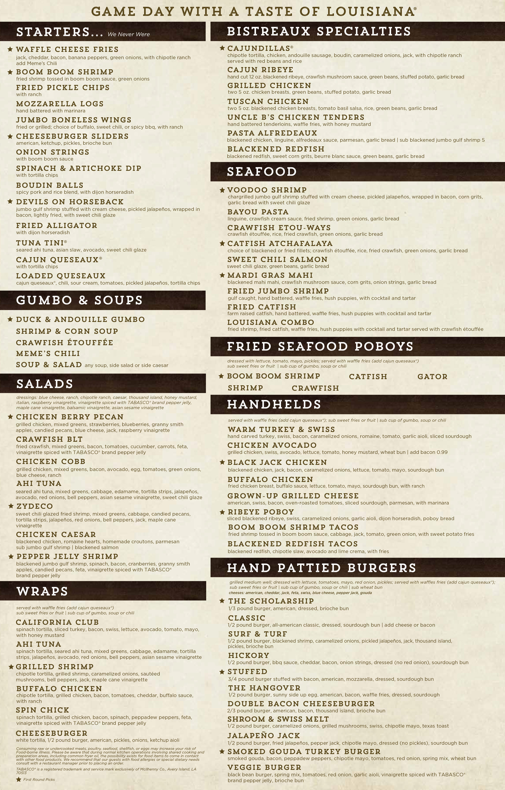 Walk-On’s Bistreaux and Bar is described as a restaurant that offers a game-day atmosphere with southern hospitality featuring menu items made from scratch using fresh ingredients.