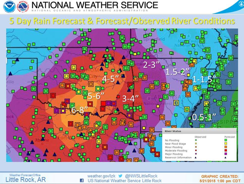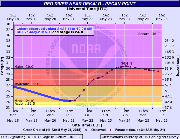 A river flood warning remains in effect for the Red River until further notice… FORECAST FLOODING INCREASED FROM MODERATE TO MAJOR SEVERITY… THE FLOOD WARNING CONTINUES FOR THE RED RIVER NEAR DEKALB AT PECAN POINT. * UNTIL FURTHER NOTICE… OR UNTIL THE WARNING IS CANCELLED. * AT 2:00 PM WEDNESDAY THE STAGE WAS 24.7 FEET. * MINOR FLOODING IS OCCURRING AND MAJOR FLOODING IS FORECAST. * FLOOD STAGE IS 24.0 FEET. * FORECAST… THE RIVER WILL CONTINUE RISING TO NEAR 31.0 FEET BY SUNDAY MORNING THEN BEGIN FALLING. * IMPACT… AT 30.0 FEET… THOUSANDS OF ACRES OF FARM LAND AND PASTURE FLOOD. LIVESTOCK MUST BE EVACUATED TO HIGHER GROUND. MUCH OF THE FLOOD PLAIN IS INUNDATED, AND PREPARATIONS FOR A MAJOR FLOOD SHOULD BE MADE AS SOON AS POSSIBLE. * ADDITIONAL HEAVY RAINFALL REMAINS QUITE POSSIBLE OVER THE ENTIRE UPPER RED RIVER BASIN DURING THE NEXT FIVE DAYS. UPWARDS OF SIX INCHES REMAIN POSSIBLE THROUGH THIS MEMORIAL DAY HOLIDAY WEEKEND ACROSS THE RED RIVER AND ITS TRIBUTARIES IN SOUTHERN OKLAHOMA AND NORTH TEXAS. AREA RESERVOIRS INCLUDING LAKE TEXOMA CONTINUE TO FILL AS THIS VERY WET SPRING OF 2015 CONTINUES. SOILS REMAIN SATURATED ACROSS NORTH TEXAS AND SOUTHERN OKLAHOMA AND NEARLY ALL OF THE RED RIVER’S TRIBUTARIES REMAIN ABOVE FLOOD STAGE. * AREA FARMERS… RANCHERS… AND RESIDENTS ON THE RED RIVER NEED TO CLOSELY MONITOR THE WEATHER AND RED RIVER STAGES THROUGH THE FIRST WEEK OF JUNE. A MAJOR FLOOD EVENT COULD DEVELOP DURING THIS MEMORIAL DAY WEEKEND AND INTO THE FINAL WEEK OF MAY. THIS FLOOD WARNING IS FOR A MAJOR CATEGORY FLOOD AND PRECAUTIONS SHOULD BE MADE IMMEDIATELY.