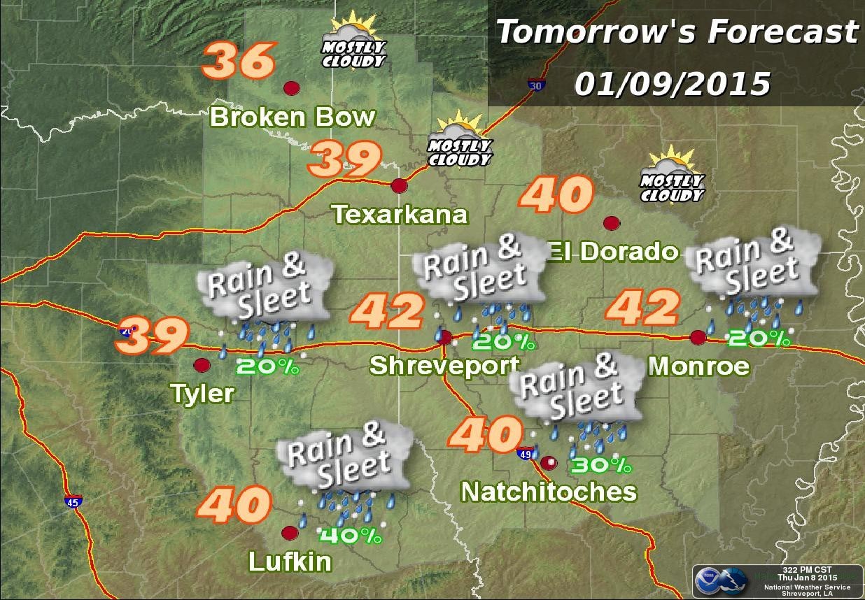According to the outlook a round of freezing rain is expected to develop Saturday night … especially over northeast Texas north of Interstate 20, southwest Arkansas, and extreme southeast Oklahoma. Ice accumulations of up to a tenth of an inch will be possible through sunday morning.