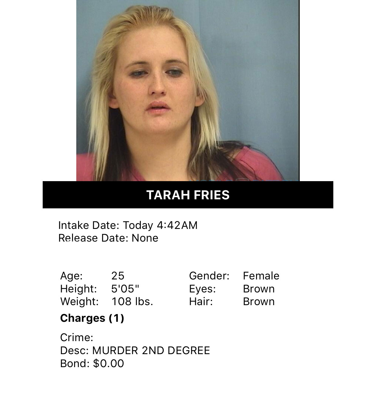 According to Miller County Jail records 25-year-old Tarah Fries was booked at 4:42 a.m Tuesday for 2nd degree murder.