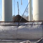 There will be several stages to the work, stated Phillips. First, the containment, seen below, was installed so that the workers can sandblast old paint down to the bare steel and then apply the first coat of primer. This process will be facilitated by a machine with a bucket to help position the workers next to the tower to apply the paint.