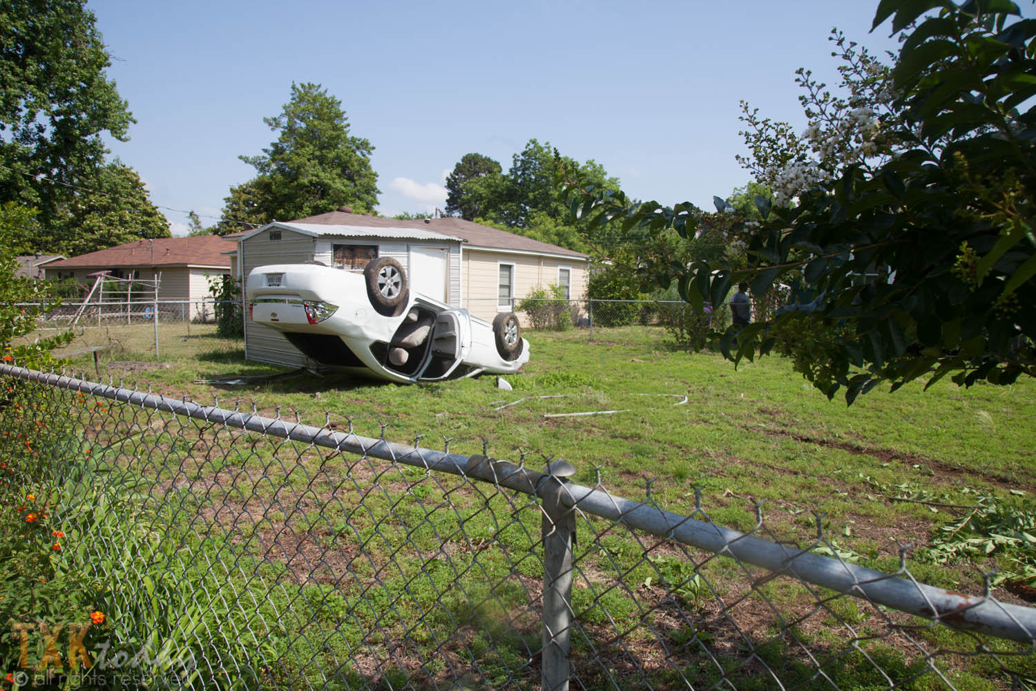 No major injuries were reported in a a two vehicle accident that left one vehicle upside down in the backyard of a residence on Old Boston Rd.