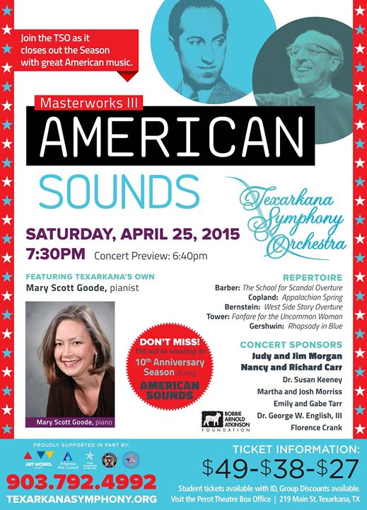 The TSO presents a concert of works by great American composers featuring Gershwin's Rhapsody in Blue and TSO's premiere performance of Aaron Copland's Appalachian Spring. For Tickets call: 903-792-4992. Student and Group Discounts Available. Concert Preview at 6:40pm.
