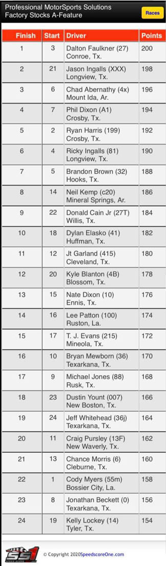 In the Professional Motorsport Solutions Factory Stocks A-Feature race, Dalton Faulker of Conroe came in 1st place, Jason Ingalls of Longview finished in 2nd place and Chris Abernathy of Mount Ida placed 3rd.
