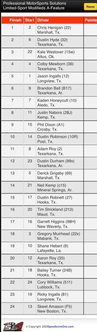 In the Professional Motorsport Solutions Limited-Sport Modified A-Feature race, Chris Henigan of Marshall finished in 1st place, Dustin Hyde of Texarkana placed 2nd and Kale Westover of Atlas, Oklahoma’s placed 3rd.