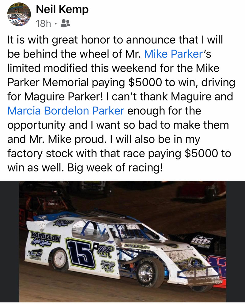 This race was renamed this year due to the unexpected passing of Mike Parker on Memorial Day. He was a long time supporter of this race and enjoyed competing in it. Also, his car will be driven by good friend and fellow racer Neil Kemp and his son Maguire will carry the flag for the National Anthem.